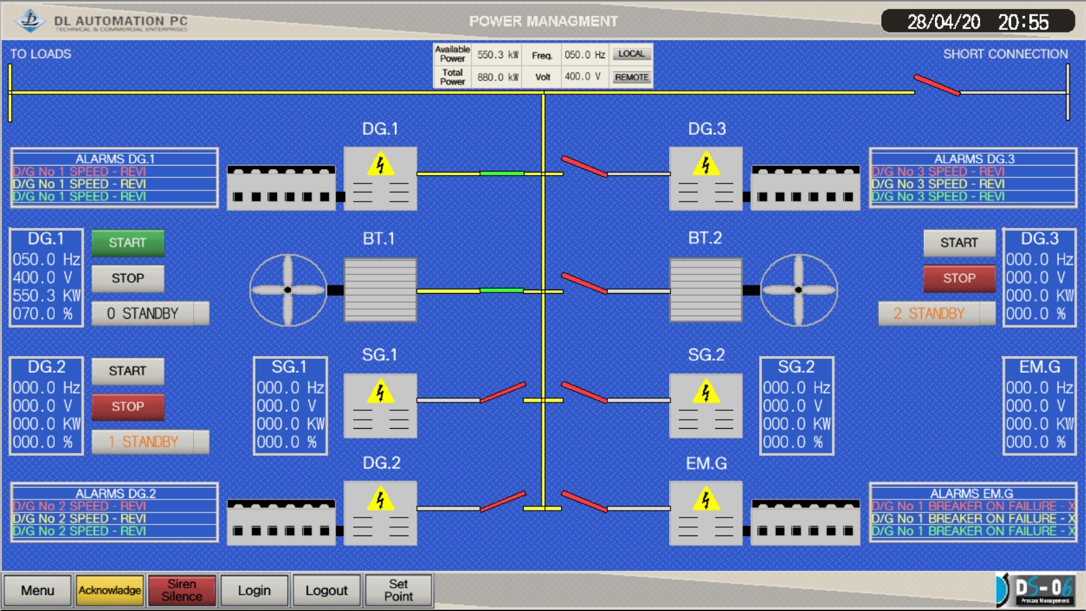 The power management system is an integral part of the DS-06 Alarm & Monitoring marine automation system. Control is done by the distributed process units and the operator interaction from interactive color graphic pictures on the remote operating stations, or locally from the local operating station.